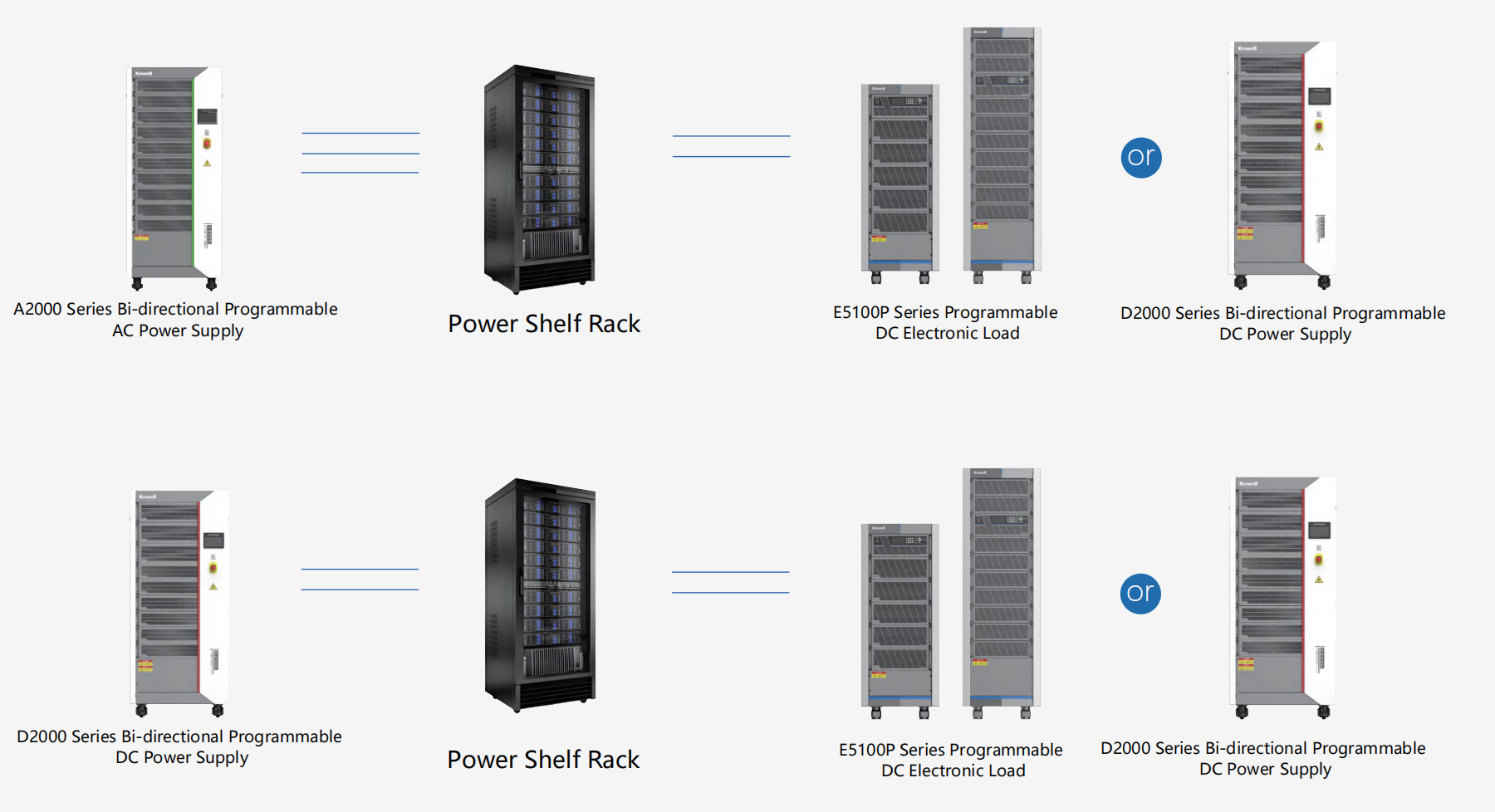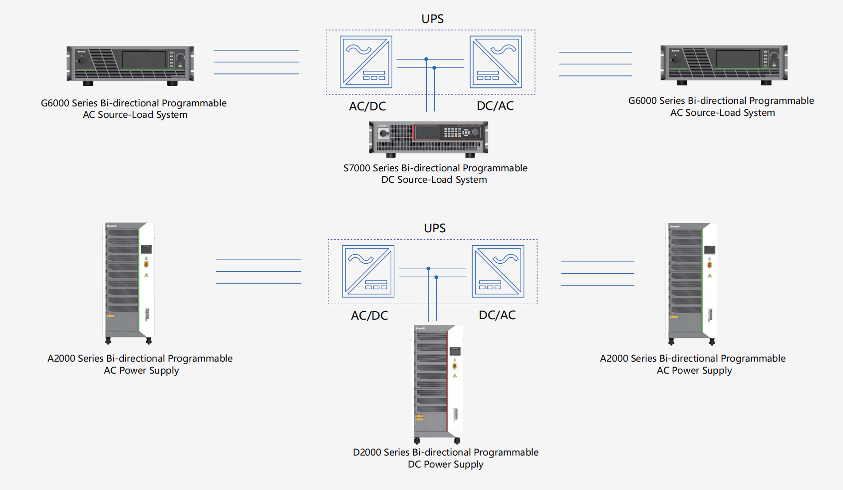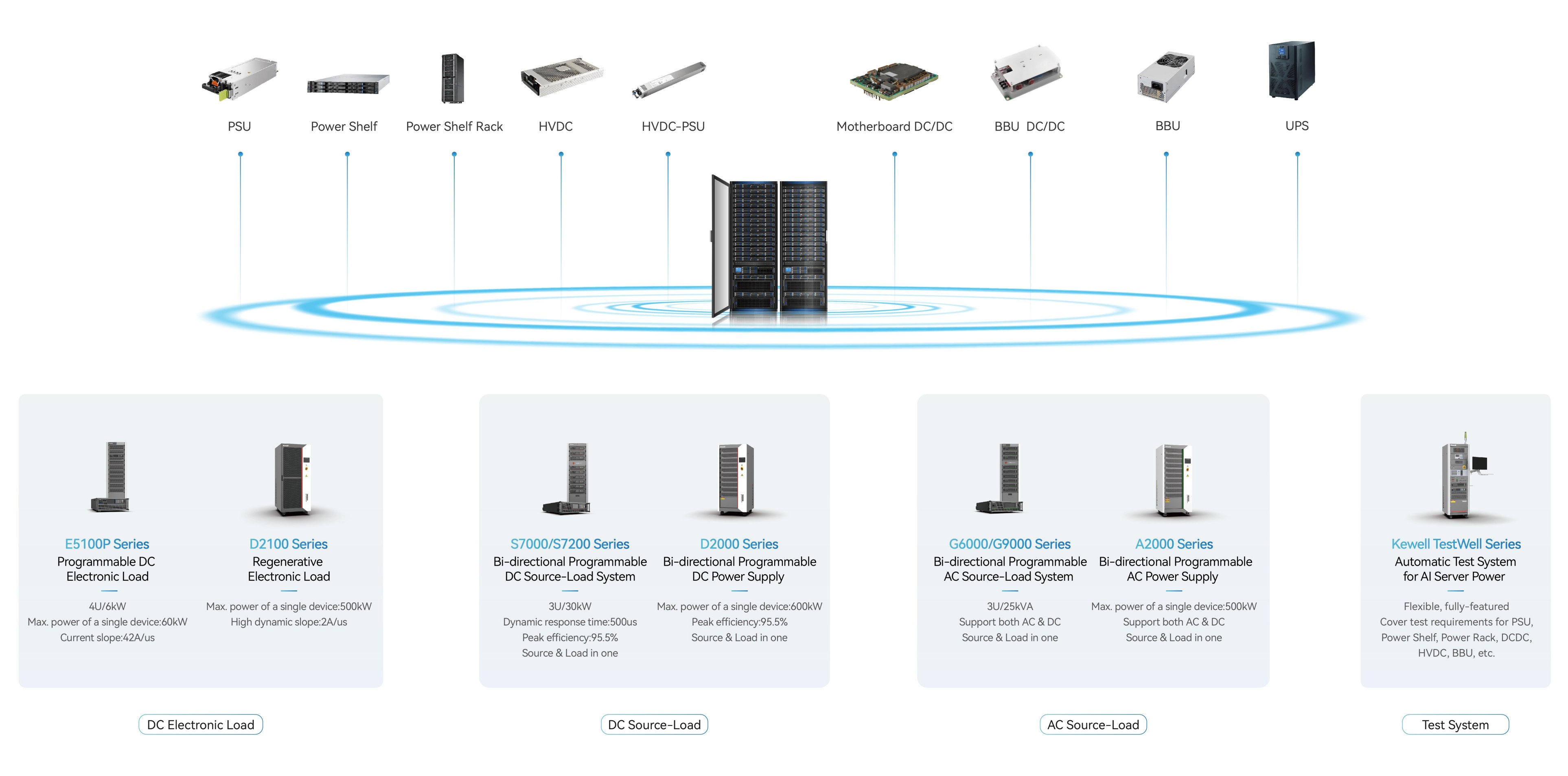 Kewell empowers AI server power testing with a one-stop solution, precisely targeting three key areas: DC conversion and basic power supply modules, centralized power supply rack systems, and BPS and UPS systems. By integrating AC/DC power supplies, loads, and automated test systems, we build highly efficient test platforms. This helps customers significantly boost testing efficiency and solidify the foundation of product reliability.