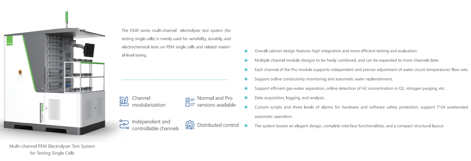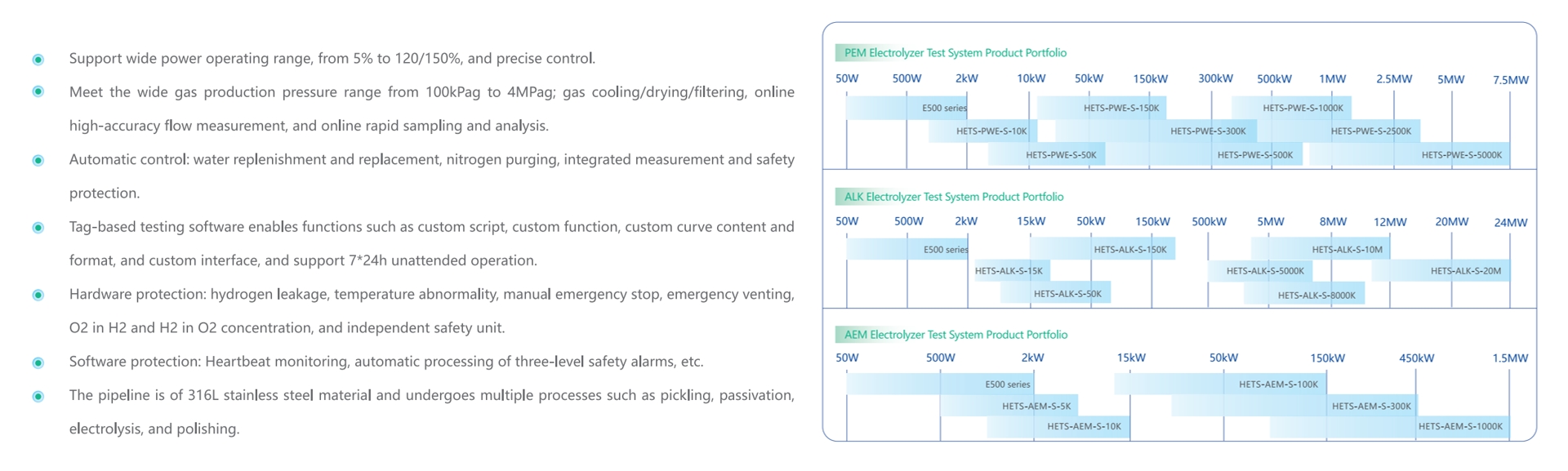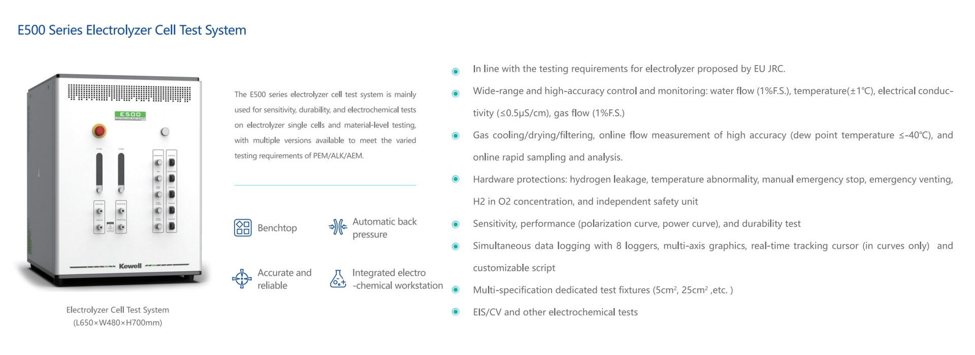 E500シリーズ電解槽試験第は、シングルセル試験を主目的とし、水電解に関する材料レベルの研究開発・検証試験(限界性能試験、ストレス条件試験、電気化学試験、耐久性試験を含む)を対象としています。本電解槽シングルセル試験台は、高精度データ取得と高速応答性を特徴とし、PEM・ALK・AEM電解槽の試験要件を満たすことが可能です。