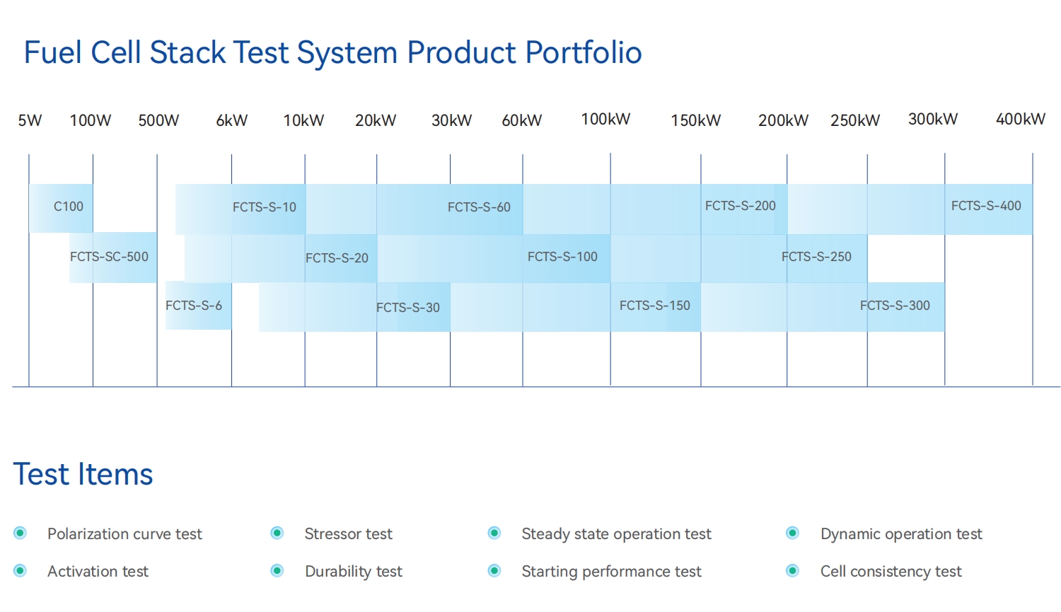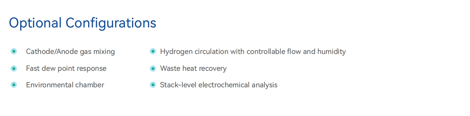 FCTS-Sシリーズは、燃料電池スタック向けに高精度・高信頼性・高利便性を備えた試験プラットフォームを提供しています。本試験台は主に、ガス流量・圧力制御ユニット、ガス温度・湿度制御ユニット、熱管理システム、安全保護ユニット、電子負荷装置、セル電圧監視ユニットで構成されています。試験プラットフォームによるオンラインデータ監視・処理により、試験対象スタックの性能、寿命、信頼性、安全性の分析が可能となります。燃料電池スタックの研究開発、較正、最終試験(EOL)に適用可能です。