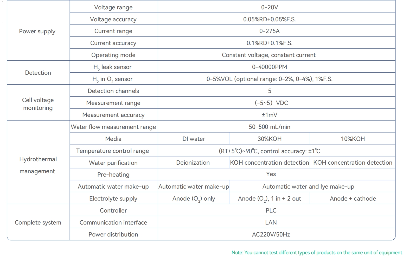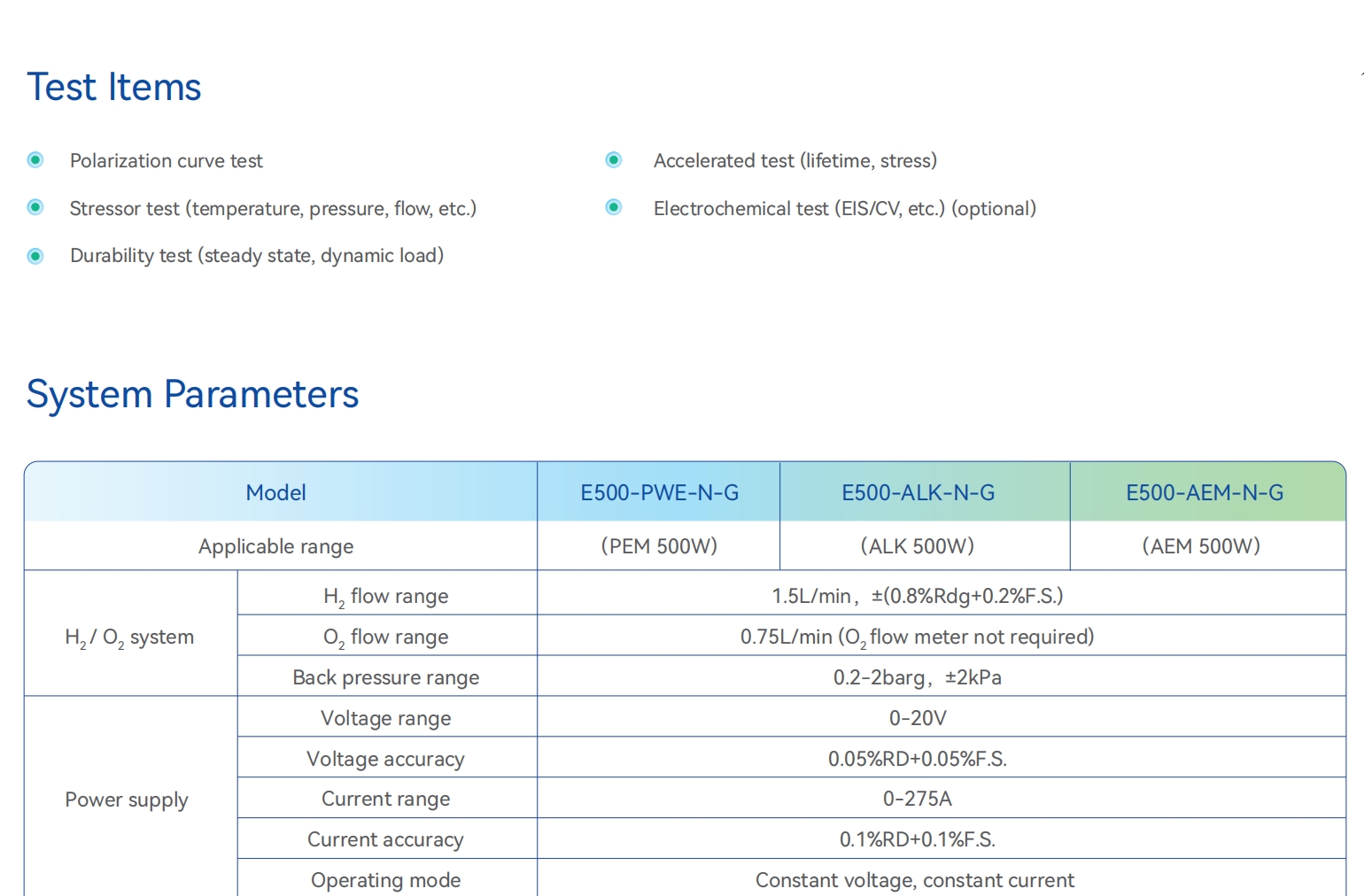 E500シリーズは、PEM/ALK/AEM電解槽のシングルセルおよび材料レベル試験向けに、正確かつ信頼性の高いプラットフォームを提供することを目指します。本試験台は主に、循環システム、窒素パージユニット、圧力調整ユニット、ガス水分離ユニット、ガス分析前処理ユニット、PLC計測制御ユニット、HMI、安全監視ユニットで構成されています。自社開発の試験ソフトウェアにより、分極曲線試験、電気化学試験、酸素中水素濃度オンラインモニタリング、ストレス試験、耐久性試験に加え、水素生成効率試験、水素品質試験、製品寿命試験をサポートします。
