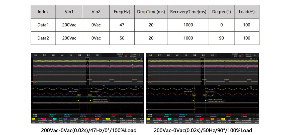 To ensure the reliability of server power supplies in scenarios such as grid fluctuations and unexpected power outages, it is necessary to verify their withstand, protection mechanisms, and output continuity during the "input power interruption-recovery" process. The G6000/G9000 Series Bi-directional Programmable AC Power Supply meets the input power down test requirements with their flexible programmable control for voltage and frequency output.