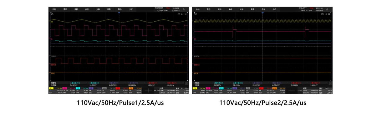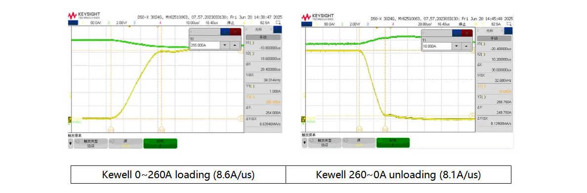 The dynamic response test of server power supplies has stringent requirements for high-speed dynamic loading. According to the standards, the current slope for a single PSU test is ≥ 2.5A/μs. The measured current slope data of the E5100 Series Programmable DC Electronic Load from a customer site is shown in the figure below, and the maximum slope of this series can reach 80A/μs.